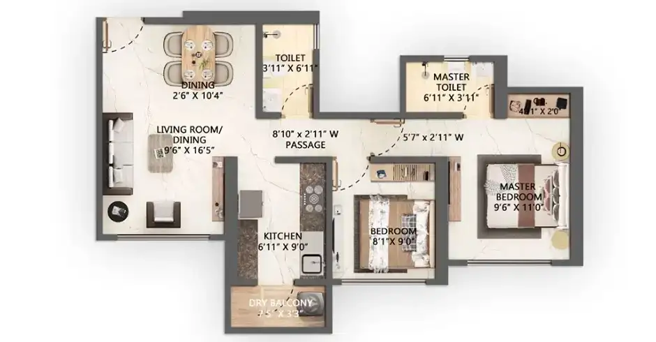 A: The project exclusively offers premium 1 BHK, 2 BHK & 2.5 BHK configurations with optimized carpet areas.
